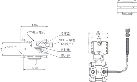 ⑤ GP型單法蘭液位變送器一側毛細管長度一般為1.5米,zui長不宜超過3米(特殊情況協議商定)。